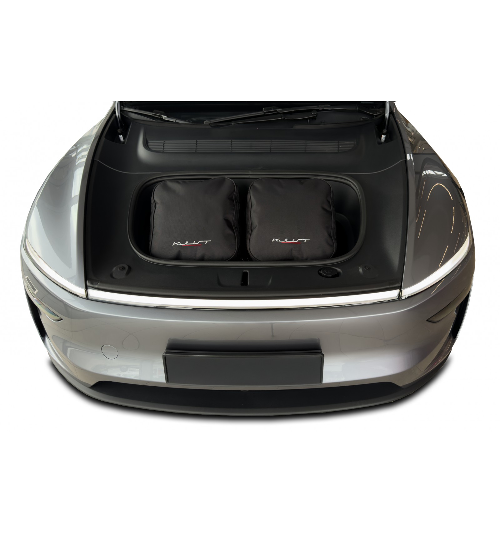 Zestaw dwóch toreb KJUST został zaprojektowany specjalnie pod wymiary przedniego bagażnika Tesli model Juniper. Ich asymetryczny kształt precyzyjnie odwzorowuje wnękę (frunk), co pozwala na pełne zagospodarowanie dostępnego tam miejsca. Dzięki temu użytkownik zyskuje dodatkowe 60 litrów praktycznej i uporządkowanej pojemności ładunkowej, idealnie dopasowanej do bryły pojazdu.